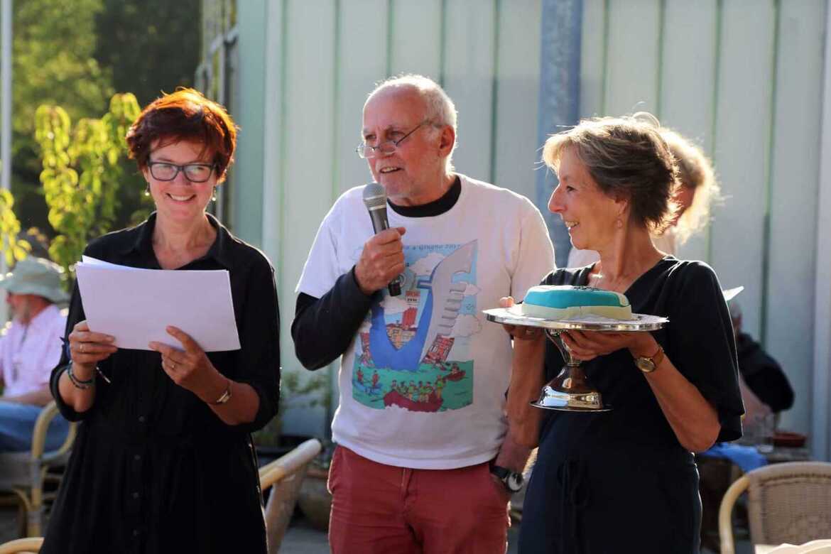 Met de door Mehdi aangeboden bubbels werd geproost op zijn komst als nieuwe pachter en kwamen de eveneens door hem aangeboden gazpacho, burgers en frites door. Daar werd op het volle terras flink van gesmuld.